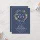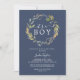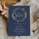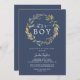 Cet automne de la marine verdoyante est une invitation garçon baby shower est parfait pour un baby shower automne. Le design rustique moderne présente des feuilles bleu marine, vert sauge et or avec des branches de fleurs bleu foncé.