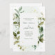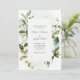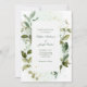 Ces invitations à mariage botaniques à la mode et belle présentent des feuilles vert aquarelle luxuriants et d'élégants accents faux or. Il y a aussi la calligraphie de script moderne et le texte classique, et des éclaboussures d'aquarelle verte subtiles décorent l'arrière - plan blanc.
