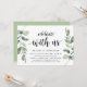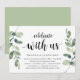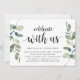 Carte d'invitation sur le thème de la verdure moderne rustique Eucalyptus, écriture noire (avec titre de carte : célébrez avec nous). Elle est parfaite pour votre réception de mariage en fuite / fête de célébration post-mariage. Ajoutez vos détails dans une police / lettrage noir assorti.