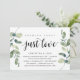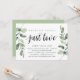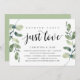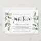 Carte d'invitation sur le thème de la verdure moderne rustique Eucalyptus, écriture noire (avec titre de carte : Rien de fantaisiste, juste de l'amour). C'est parfait pour votre réception de mariage en fuite / fête de célébration post-mariage. Ajoutez vos détails dans une police / lettrage noir assorti.