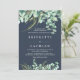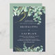 Chic et élégant faire-part de mariage botanique d'eucalyptus. Frammentez vos détails du jour de mariage avec des feuilles eucalyptus dans la verdure et le feuillage bleu avec un arrière - plan bleu nuit et des lettres blanches élégantes. Personnalisez facilement ce modèle d'invitation avec les détails de votre jour de mariage.