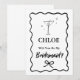 Faites votre demande en demoiselle d'honneur avec style avec cette carte de proposition rétro-chic ! Avec une bordure ondulée funky, un verre à martini classique et un nœud papillon ludique, cette invitation vibrante est parfaite pour demander « Voudrez-vous être ma demoiselle d'honneur ? » de manière amusante et inoubliable. Idéal pour les amateurs de vintage et les mariées modernes !