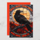 Décoré de vitraux, un corbeau déplaisant éffrayant tourne son regard vers le spectateur.