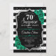 Invitation surprise 70e anniversaire de fête. Design noir féminin, blanc et vert émeraude avec faux argent parties scintillant. Comprend des rayures en noir et blanc, des roses, des caractères de script et des confettis. Parfait pour une célébration anniversaire féminine élégante. Peut être personnalisé pour montrer n'importe quel âge. Invitations Zazzle imprimées ou téléchargement instantané modèle imprimable numérique.