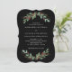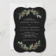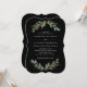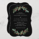 Ce magnifique faire-part de mariage de vacances propose d'élégants bouquets botaniques avec des feuilles en faux or, de la verdure de Noël et des baies rouges sèches sur un arrière - plan noir moderne. Parfait pour votre mariage d'hiver élégant.