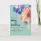Cette invitation de mariage à l'aquarelle vert menthe présente des florales artistiques audacieuses dans des tons de corail, rose blush, pêche et magenta, créant une palette de couleurs tropicales vibrantes et élégantes. Le fond vert menthe frais ajoute une touche moderne et aérienne bohème, parfaite pour les couples qui veulent un design de mariage coloré, artistique et élégant.