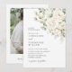 Une invitation de mariage romantique à fleurs vert sauge et blanc avec un design élégant de dos de photo.