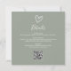 Une invitation de baby shower tout-en-un minimaliste moderne avec un cœur dessiné à la main, un code QR de liste de naissance et des détails d'événement en typographie élégante sur fond vert sauge. Conçu par Thisisnotme©