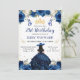 Elégante aquarelle Black Haired Salon princess dans le design habillé bleu marine avec fleurs bleues et blanches, papillons et confettis de parties scintillant argent.