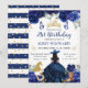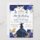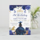Elégante aquarelle Black Haired Salon princesse occidentale dans la Marine Design habillé bleu avec fleurs bleues, papillons, fer à cheval, cheval et botte et parties scintillant d'or confetti.