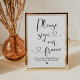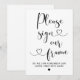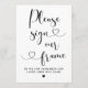 Veuillez signer notre panneau de mariage à cadre présente une écriture calligraphique moderne avec des accents de coeur et une demande simple de livre d'or pour vos invités de mariage. Les couleurs noir et blanc peuvent être modifiées.