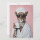 Un chic léopard profite d'une matinée cosy, enveloppé d'une robe blanche avec une serviette sur la tête, sirotant du café tout en portant des lunettes de soleil contre un arrière - plan rose chic.