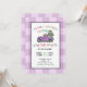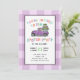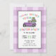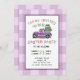 Invitez vos invités avec style avec cette invitation de fête de Pâques joyeuse. Ce design présente un lapin beige chevauchant dans un camion vintage à carreaux violet. À l'arrière se trouve un panier débordant d'œufs colorés de turquoise, rose, violet et orange. Au-dessus est écrit, " Vous êtes invités à notre fête de Pâques" en typographie colorée. Personnalisez avec les détails de votre fête. Conçu par l'artiste de renommée mondiale ©Tim Coffey.