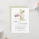 Invitations d'anniversaire pour adultes sur le thème du vin avec une illustration aquarelle de deux verres de vin rouge à côté d'une assiette de coins de fromage. Peut être changé à n'importe quel âge. Belle scène de table avec les détails de votre événement ci-dessous. L'envers est un vert clair de coordination.