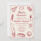 De style rétro, le design de cette fête, de style fantaisiste et fantaisiste, présente une couleur rouge vif classique, un cadre ondulé ludique et des illustrations de la cuisine italienne. Associé à d'élégantes polices de caractères à la main, ce design est parfait pour ajouter une touche de vintage allure à votre événement. Idéal pour des dîners de répétition, des soirées de fiançailles, des douches pour couple ou des douches nuptiales, surtout pour ceux qui ont pour thème la pizza ou les pâtes.