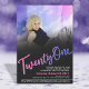 Moderne simple et élégant, Twenty One audacieux violet à rose texte et propre invitation d'anniversaire photo. Personnalisez ce jalon qui arrive à l'âge de 21e anniversaire script de fête photo invitation anniversaire avec vos propres détails de fête d'anniversaire, et une photo de votre fille ou garçon d'anniversaire. D'autres années et les articles correspondants sont disponibles. © Design original par Sarah Trett pour www.mylittleeden.com sur Zazzle.