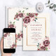 Moderne et tendance, ce design faire-part de mariage présente des flores roses vintages d'aquarelle en bordeaux et rose roux, avec une boîte de texte en faux or mat, et un motif floral sur tout le dos. Copyright Invitations élégants, tous droits réservés.