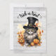 Ajoutez votre touche spéciale à ce design d'Halloween amusant avec un chaton vintage mignon portant un casquette de sorcière noir et assis dans un patch citrouille sculpté avec les mots "tricoter ou traiter" dans une police de script amusante sur le devant. Le dos contient le même chat et les détails de votre fête. Un arrière - plan en bois clair rustique se trouve de part et d'autre.