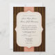 Ce design est composé d'un arrière - plan rayé brun chocolat et d'un cadre crème découpé simple et élégant placé sur un ruban rose pâle texturé. Le texte alterne entre les polices Garamond classiques et les polices de mariage de script, avec un script supplémentaire qui s'épanouit pour le style entre la date et l'emplacement du mariage. Le design a été donné une impression vieillotte et désespérée pour compléter le design vintage. Un monogramme personnalisé initial dans son propre cadre plus petit cravate le dos de la carte d'invitation dans la conception globale. Ces invitations sont classiques mais pas trop formelles, dégageant un charme vintage et suranné avec une douceur et un style contemporain.