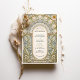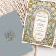 Cette carte de faire-part de mariage exquise présente un design Art Nouveau époustouflant, inspiré par le flux organique et les détails complexes des arts décoratifs du début du XXe siècle. Sur le devant, une arche fleurie méticuleusement rendue, avec des éléments botaniques sculpturaux gaufrés dans les tons crème douce, or et sauge, sur un arrière - plan bleu pâle. Fleurs ornementales, motifs voûtés et rouleaux feuillus forment un cadre romantique autour des détails mariages, présenté dans une élégante combinaison de serif et de police de script. Le revers de la carte porte un monogramme minimaliste de style crête avec un arbre stylisé entouré de feuilles de lauriers et un ruban coulant. Parfait pour les couples à la recherche d'une esthétique raffinée et intemporelle, cette invitation est idéale pour les mariages formels à thèmes vintages, botaniques ou romantiques.