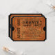 Déplaisant orange hantée maison billet de fête Invitation, fonctionnalités coins coupés, orange foncé arrière - plan patiné avec l'image graphique Web araignée, dans un style de ticket faux. customiser avec vos informations de fête. Fait un grand invitation unique, stylisé pour ressembler à un vrai billet d'entrée, cet invitation audacieux et amusant est parfait pour une fête à tout âge ! Le dos contient un design orange vieilli avec toile d'araignée et chauves-souris noires.
