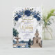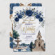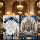 Transport your guests to Italy with this luxurious design featuring the Milan Cathedral, navy roses, and swans. Perfect for sophisticated destination weddings.This design features a romantic watercolor illustration of the Duomo di Milano (Milan Cathedral) centered behind a grand fountain featuring two white swans in a heart-shaped embrace. The architecture is framed by an ornate arch of deep navy blue roses and printed faux gold leaves, set against a classic white marble texture background. The typography utilizes an elegant faux gold foil script for the couple's names, simulating a luxury metallic shine.This is a flat printed image with a printed faux foil and marble effect, not actual raised foil or stone material.