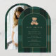 This vintage teddy bear baby shower invitation features a timeless, preppy aesthetic inspired by classic nursery style and polo-inspired celebrations. A soft, hand-painted teddy bear illustration sits within an elegant arched frame, layered over a rich green plaid background for a refined yet welcoming look.