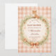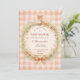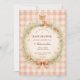 A charming woodland-inspired baby shower design featuring a sweet watercolor fox resting above a delicate floral wreath. Soft greenery, tiny mushrooms, and wildflowers create a cozy forest frame, finished with a warm bow and a soft peach gingham background. The vintage storybook illustration style and gentle earthy palette give the design a whimsical woodland nursery feel, perfect for celebrating a little one in a warm and magical forest setting.