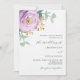 Un arrière - plan blanc. Décoré de violet, de fleurs violettes, de fleurs roses et de feuilles d'eucalyptus vert aquarellés, de sprigs, de verdure et d'un faux sprigs d'or. Personnalisez et ajoutez vos noms et détails. Retour : ajoutez l'URL de votre site Web mariage au code QR pour plus de détails et/ou RSVP.