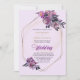 Un beau bouquet floral violet et violet d'aquarelle est agrémenté de bourgeons noirs violet profond et de feuilles au sommet d'un double cadre hexagone doré à l'avant de ce faire-part de mariage. Un deuxième bouquet, plus petit, est situé en bas à gauche du cadre. Votre texte personnalisé est en violet noir, or, et assorti violet à l'intérieur du cadre. Un tourbillon de parties scintillant en faux or subtil est placé sur le centre, et tout est placé sur un arrière - plan lavande pâle. L'arrière de l'invitation est solide assorti violet, avec la même parties scintillant tourbillonnant au centre. Très élégant pour les mariages de printemps, d'été ou d'automne.