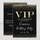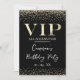 Cette invitation de fête à accès total VIP glamour présente un design sophistiqué sur fond noir. Le titre VIP est imprimé dans une police de style feuille d'or, suivi du titre de l'événement. Une bande de diamants pailletés d'or accentue les parties supérieure et inférieure. Le lieu et l'heure de la fête ou de l'événement sont imprimés au dos. C'est parfait pour un anniversaire, un sweet 16, une douche de mariée ou autre célébration élégante.