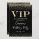 Cette invitation de fête à accès total VIP glamour présente un design sophistiqué sur fond noir. Le titre VIP est imprimé dans une police de style feuille d'or, suivi du titre de l'événement. Une bande de diamants pailletés d'or accentue les parties supérieure et inférieure. Le lieu et l'heure de la fête ou de l'événement sont imprimés au dos. C'est parfait pour un anniversaire, un sweet 16, une baby shower, ou autre célébration élégante.