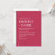 Cette invitation présente un style minimaliste moderne avec des polices de typographie en bloc propres et simples avec un arrière - plan viva magenta. La simplicité de ce design ajoute une touche d'élégance à votre mariage. Il fonctionne bien avec de nombreux thèmes mariages et certainement un grand ajout à votre mariage. Il suffit de customiser les noms et le libellé en quelques étapes simples et personnaliser la carte d'invitation avec votre photo du couple heureux et remplacer le code QR par le vôtre au dos de l'invitation pour donner à votre invitation une touche personnelle agréable. Si vous devez changer la couleur, vous pouvez customiser l'invitation à la carte. Vous pouvez customiser et personnaliser l'invitation afin de répondre à vos besoins mariages et cliquez simplement sur personnaliser de l'invitation. Vous pouvez facilement personnaliser cette invitation avec votre propre texte et la partager avec vos invités numériquement - que ce soit par le texte, par e-mail, ou par les médias sociaux. Si vous préférez, vous avez également la possibilité de poster une version imprimée à vos invités. Ou, vous pouvez faire les deux : envoyer une version numérique et le suivi avec une copie imprimée pour une touche personnelle!