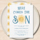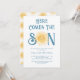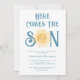 Famille Invitation et amis à votre baby shower sur le thème du soleil avec cette mignonne invitation de baby shower pour garçons de soleil. Il présente le texte "Here Comes The Son" dans la typographie bleue stylisée avec un soleil aquarelle jaune. Le dos est décoré d'un motif souriant. Facile à personnaliser. Aquarelle originale © Michele Davies.