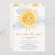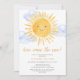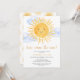 Famille Invitation et amis au baby shower de votre garçon sur le thème du soleil avec cette mignonne invitation baby shower. Il présente le texte "Here Comes The Sun" en typographie élégante avec un soleil aquarelle jaune et des nuages bleus. Le dos est décoré d'un motif souriant. Facile à personnaliser. Aquarelle originale © Michele Davies.