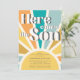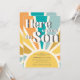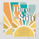 Cette joyeuse invitation au baby shower du garçon sur le thème du soleil présente "Here Comes The Son" dans la typographie rétro sur un arrière - plan de sunburst coloré. Facile à personnaliser.