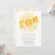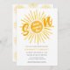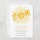 Famille Invitation et amis à votre baby shower sur le thème du soleil avec cette mignonne invitation de baby shower pour garçons de soleil. Il présente le texte "Here Comes The Son" en typographie élégante avec un soleil d'aquarelle jaune. L'arrière est décoré d'un motif solarium. Facile à personnaliser. Aquarelle originale © Michele Davies.