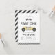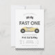 Foncez célébrer un jalon spécial avec cette invitation de premier anniversaire de voiture de course rétro. Avec une voiture de course rétro classique, des drapeaux à damier et un thème Fast One, ce design est parfait pour une célébration à haut régime. Personnalisez facilement le nom et les détails de l'événement pour créer une invitation élégante et mémorable pour le grand jour de votre petit.