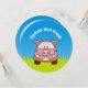 Voiture de dessin animé de cochon souriant sur herbe verte sous ciel bleu.
