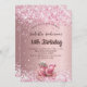 Un arrière - plan à dégradé rose vif décoré de faux étincelles, de confettis et d'un chariot vintage romantique. Personnalisez et ajoutez son nom, son âge, les détails de la fête.
