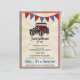 Vintage vieille voiture 90ème anniversaire invitation avec un look rétro festif, roux et bleu bunting, soleil éclat et arrière - plan de style bois de campagne. Facile de modifier le texte et le message de fête amusant! Cette voiture antique fantaisiste a des yeux pour les phares et est dessinée à la main dessin de dessin animé.