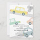 Cette invitation au baby shower, mignonne, rétro et moderne à conduire par voiture sans sexe, comporte un arrière - plan blanc avec des voitures colorées avec des ballons gris. Au verso, un arrière - plan jaune clair avec des motifs de voiture. Personnalisez-vous pour répondre à vos besoins. Vous pouvez trouver d'autres produits correspondants dans mon magasin.