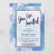 Sur un fond artistique désordonné qui présente des éclaboussures de peinture dans des nuances de bleu, de violet et de turquoise, j'ai placé un rectangle opaque bordé d'un faux doré métallique pour mettre en valeur le texte. La partie supérieure présente une couche de typographie simple qui indique "Vous êtes invité" dans une écriture manuscrite moderne et décontractée. Utilisez les champs de modèle pour ajouter vos propres détails. Toutes les couches ont été ajoutées séparément et laissées déverrouillées pour vous donner le contrôle du design. // 105 //
