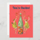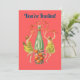 Carte vous êtes Invité avec deux femmes dansant autour d'une bouteille en verre avec des fleurs et des oranges. Design rétro avec une touche. Capture la joie de célébrer un événement. Messages ou informations personnalisables à l'avant et à l'arrière. Changez-le à tout ce que vous voulez.