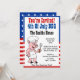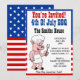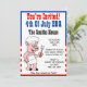 Vous êtes invité à un pique-nique du 4 juillet avec un cochon de dessin animé drôle. Mettez tout le monde dans l'ambiance de la fête avec cette invitation cool pour la fête de l'Indépendance. C'est idéal pour n'importe quel barbecue familial ou rôti de porc du 4 juillet et présente un chef cochon de dessin animé souriant. Au dos se trouvent les étoiles et les bandes. Rouge, blanc et bleu colorés.
