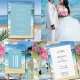 Assurez-vous que votre suite d'invitation de mariage de destination estivale est aussi belle que votre grande journée avec cette couleur d'eau tropicale colorée de plage de l'océan. Aquarelle abstrait arrière - plan avec belle eau bleue et verte et ciel avec sable de plage bronzé.