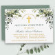 Modern Elegant First Holy Communion Invitation includes watercolor eucalyptus leaves and other beautiful botanical greenery foliage. Sage Green Back. Gold Cross.