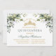 Elegant Watercolor Greenery Mis Quince Anos Quinceanera Invitation includes botanical greenery leaves. Sage Green Back. Calligraphy Script Name. Gold Tiara Crown.