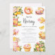 Get ready to shower the mom-to-be with love and sweetness with this beautiful baby shower card. The design is a watercolor masterpiece, featuring a delightful spread of citrus fruits, flowers, and tempting desserts like cupcakes and donuts. It's an ideal choice for a baby shower celebrating a little girl. The vibrant colors and charming illustrations create a cheerful and whimsical ambiance, ensuring your guests feel excited to celebrate. This card is sure to be a hit for any spring or summer baby shower theme.