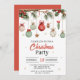 Our invitation design showcases a delicate watercolor Christmas branch adorned with holly, pine needles, and vibrant red berries. Gracefully hanging from the branch are charming ornaments—striped and patterned baubles, tiny stars, and a festive holly sprig—each suspended by fine string against a clean white background. This elegant, handcrafted look adds a warm, magical touch to any holiday celebration, making the invitation feel truly special and memorable.